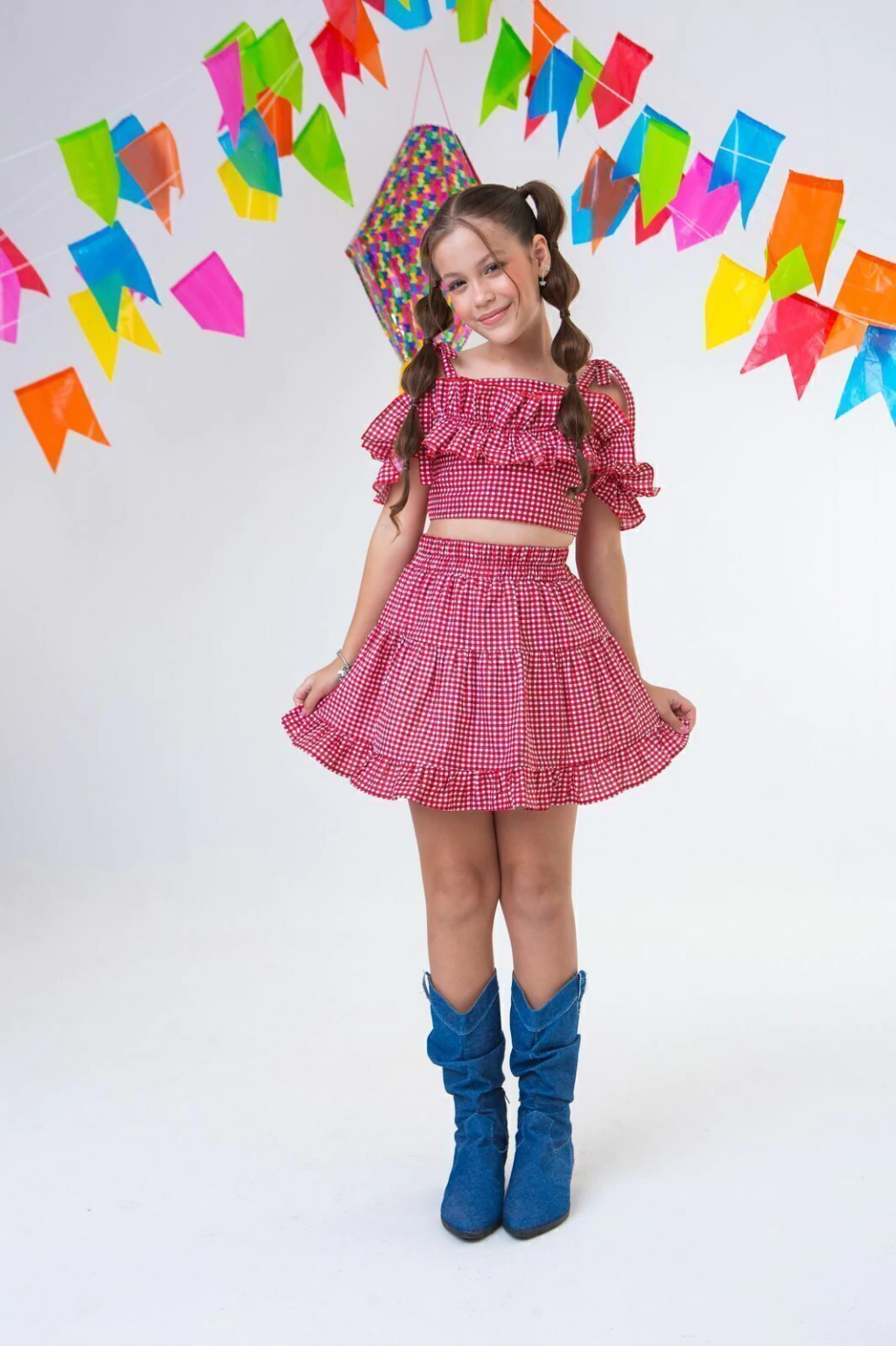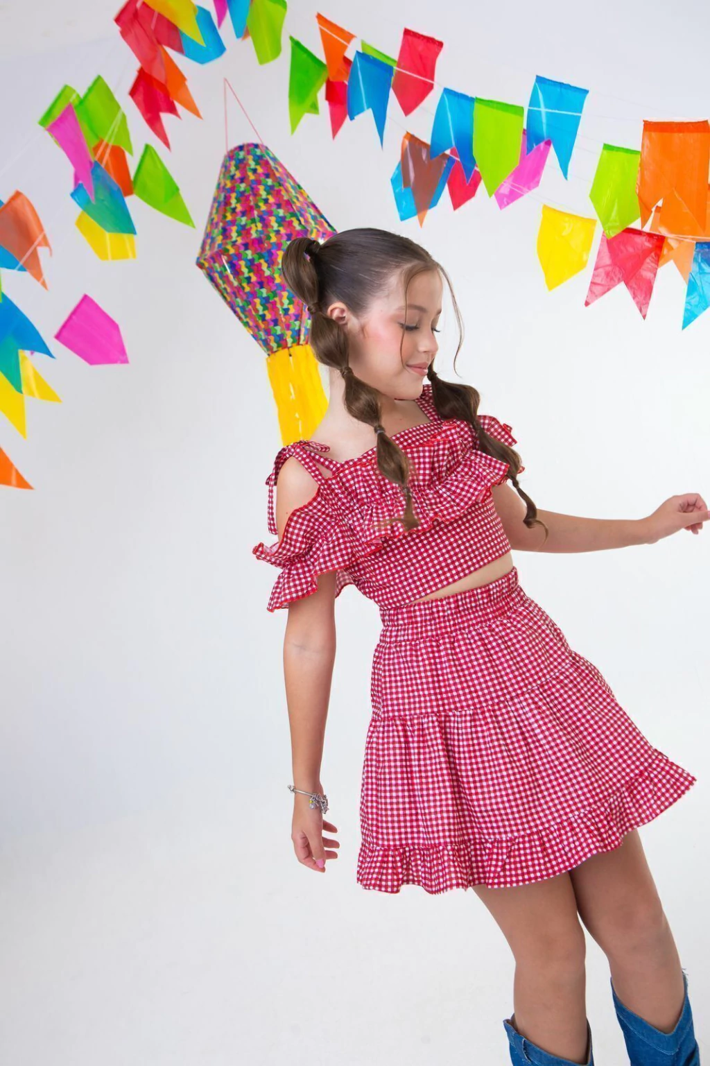 Descrição: conjunto compõe blusa babado fru-fru, alças com laços de amarração ,