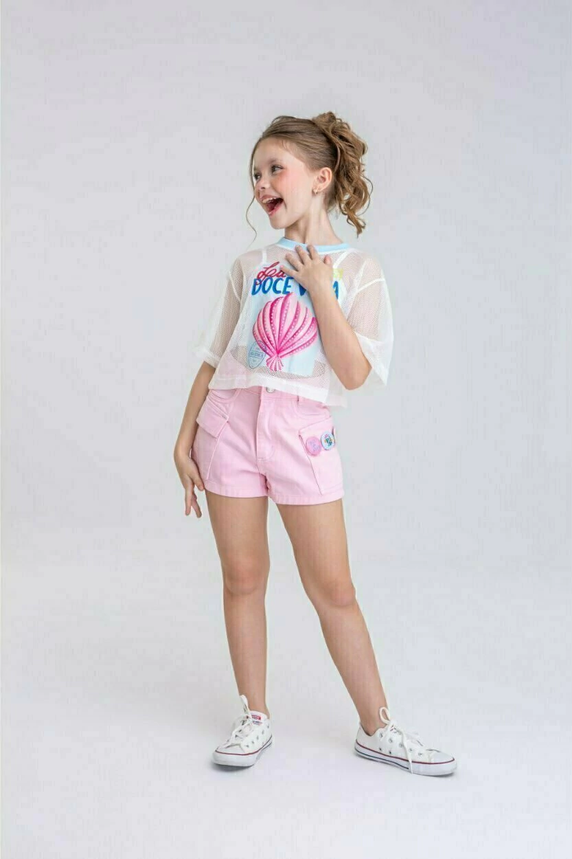 Conjunto com 3 peças. Blusa cropped em tule com elastano e top interno em malha, short em sarja de algodão super touch com regulador no cós. Look super versátil e cheio de estilo.