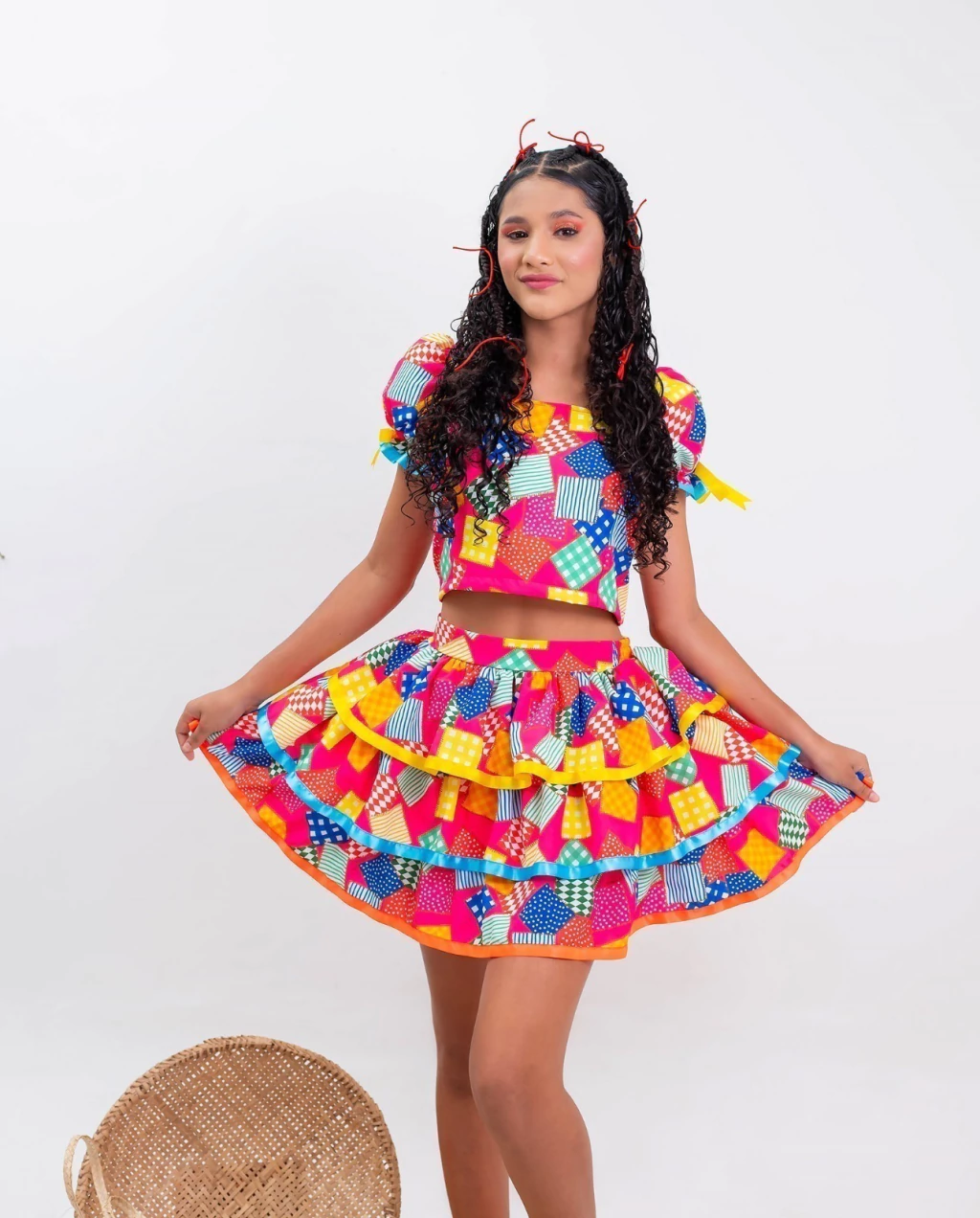 Blusa cropped com lastex nas costas, mangas bufantes com laços laterais e saia volumosa com 3 babados.
