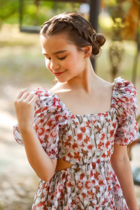 Descrição: Vestido recortes laterais ,mangas bufantes, laço de amarração nas costas em uma estampa floral exclusiva , em tecido devorê tecido nobre e sofisticado.